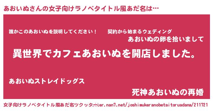 | 男性向けラノベタイトル風あだ名 | 『誰もが恐れるあのあおいぬが、ぼくの専属メイドになるようです。』 |