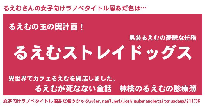 | 男性向けラノベタイトル風あだ名 | 『Re:るえむから始める異世界生活』 |