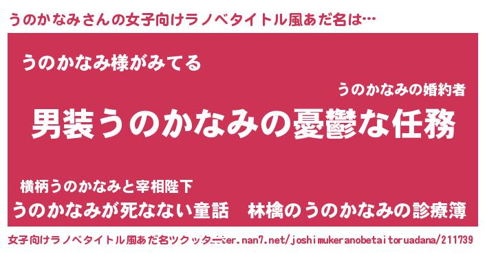 うのかなみさんの女子向けラノベタイトル風あだ名は… 『男装うのかなみの憂鬱な任務』『うのかなみ様がみてる』『うのかなみが死なない童話 林檎のうのかなみの診療簿』 ツクッター #女子向けラノベタイトル風あだ名ツクッター http://tkutter.nan7.net/joshimukeranobetaitoruadana/211739/