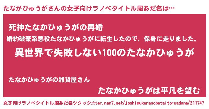 | 男性向けラノベタイトル風あだ名 | 『たなかひゅうがという概念が存在しない退屈な世界 』 |