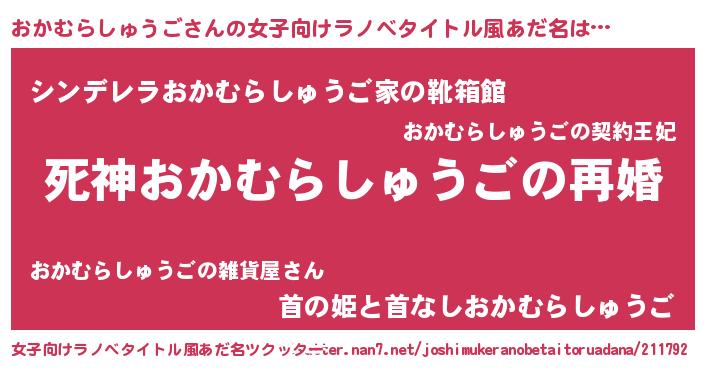 | 男性向けラノベタイトル風あだ名 | 『ノーゲーム・ノーオカムラシュウゴ』 |