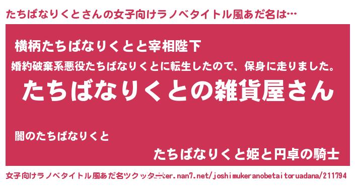 | 男性向けラノベタイトル風あだ名 | 『やはりたちばなりくとの青春ラブコメはまちがっている 』 |