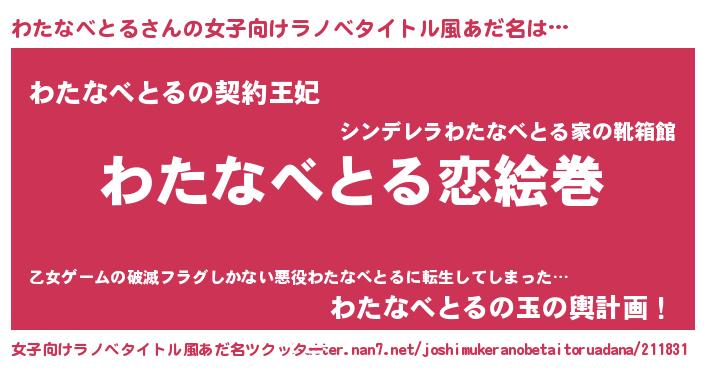 | 男性向けラノベタイトル風あだ名 | 『おまえをオタクにしてやるから、俺をわたなべとるにしてくれ! 』 |