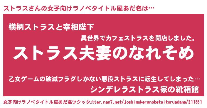 | 男性向けラノベタイトル風あだ名 | 『おまえをオタクにしてやるから、俺をストラスにしてくれ! 』 |