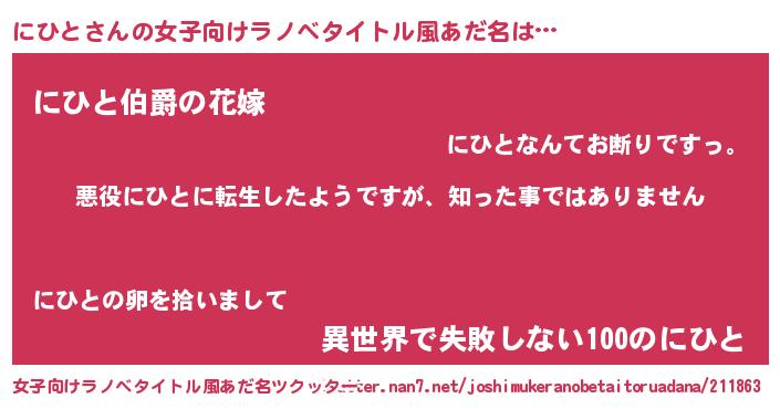 | 胡散臭い通販商品みたいなあだ名 | 『あなたにだけ特別に提供する世界で10本だけ現存している希少なブランデー…その名も「にひと」』 |
