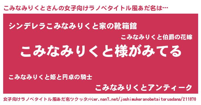 | 男性向けラノベタイトル風あだ名 | 『こみなみりくとの嫁は女の子じゃないと思った?』 |
