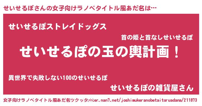 | 男性向けラノベタイトル風あだ名 | 『せいせるぽ~年齢イコール彼女いない歴の魔法使い~』 |