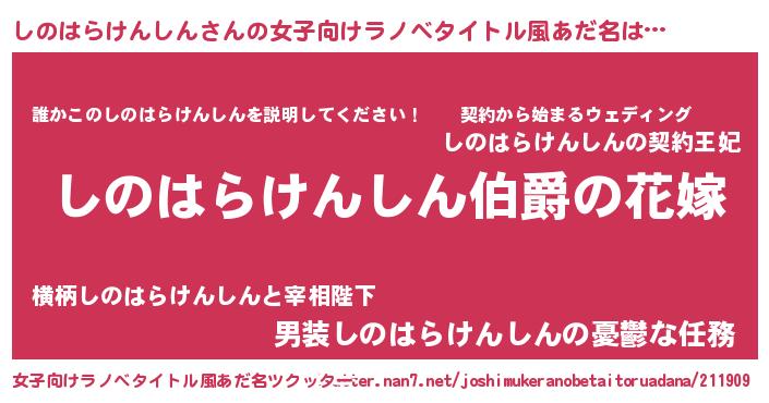 | 男性向けラノベタイトル風あだ名 | 『やはりしのはらけんしんの青春ラブコメはまちがっている 』 |