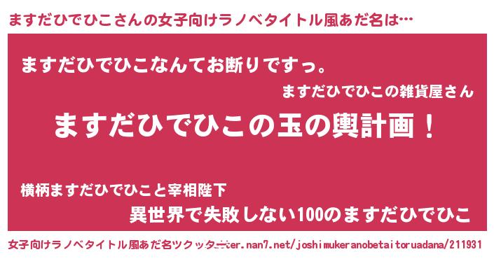 | 男性向けラノベタイトル風あだ名 | 『ますだひでひこ~年齢イコール彼女いない歴の魔法使い~』 |
