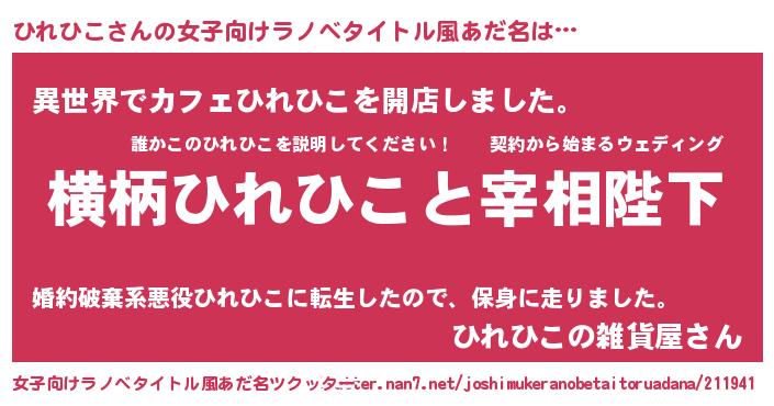 | 男性向けラノベタイトル風あだ名 | 『ひれひこに滅ぼされるだけの簡単なお仕事です』 |
