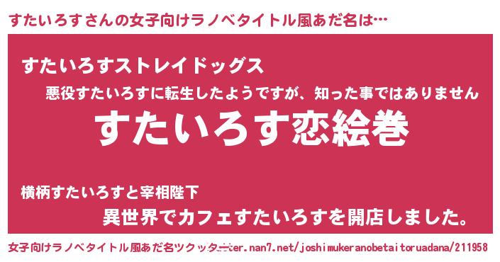 | 男性向けラノベタイトル風あだ名 | 『おまえをオタクにしてやるから、俺をすたいろすにしてくれ! 』 |