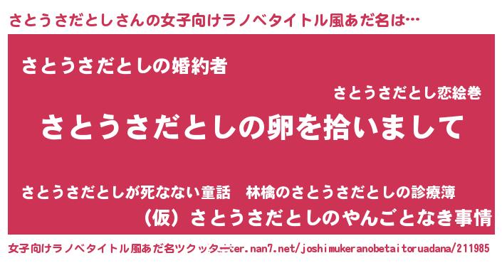 | 男性向けラノベタイトル風あだ名 | 『さとうさだとしの嫁は女の子じゃないと思った?』 |