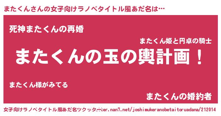 | 男性向けラノベタイトル風あだ名 | 『またくん~年齢イコール彼女いない歴の魔法使い~』 |