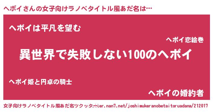 | 男性向けラノベタイトル風あだ名 | 『ヘボイという概念が存在しない退屈な世界 』 |