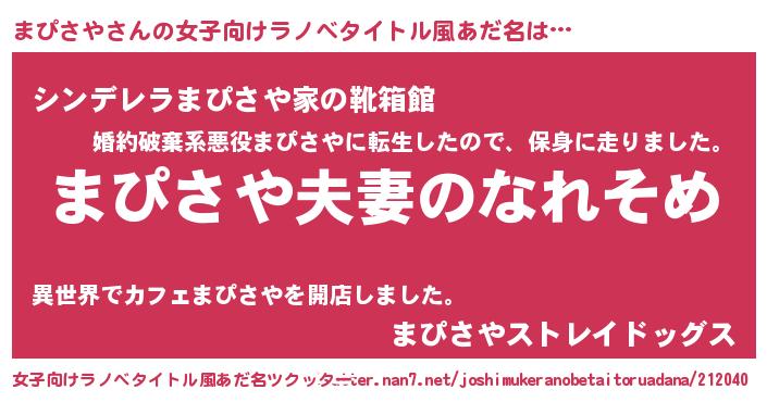 | 男性向けラノベタイトル風あだ名 | 『おまえをオタクにしてやるから、俺をまぴさやにしてくれ! 』 |