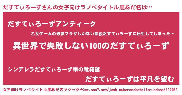 だすてぃろーずさんの女子向けラノベタイトル風あだ名は… 『異世界で失敗しない100のだすてぃろーず』『だすてぃろーずアンティーク』『だすてぃろーずは平凡を望む』 ツクッター #女子向けラノベタイトル風あだ名ツクッター http://tkutter.nan7.net/joshimukeranobetaitoruadana/212051/