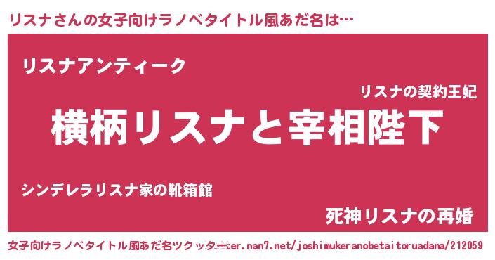 リスナさんの女子向けラノベタイトル風あだ名は… 『横柄リスナと宰相陛下』『リスナアンティーク』『死神リスナの再婚』 ツクッター #女子向けラノベタイトル風あだ名ツクッター http://tkutter.nan7.net/joshimukeranobetaitoruadana/212059/