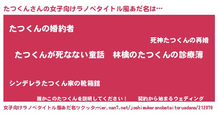 | 男性向けラノベタイトル風あだ名 | 『魔弾の王とたつくん』『緋弾のタツクン』 |
