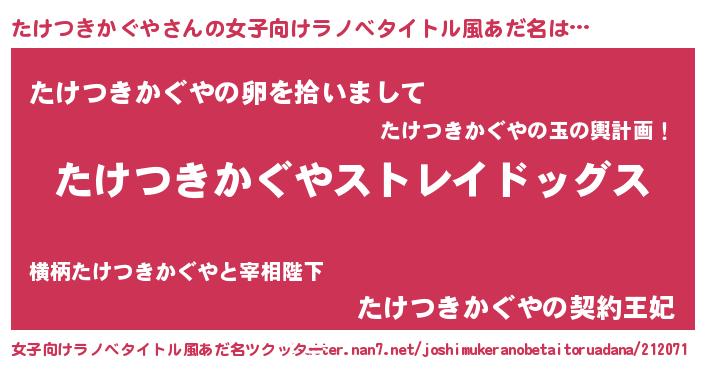 | 男性向けラノベタイトル風あだ名 | 『Re:たけつきかぐやから始める異世界生活』 |