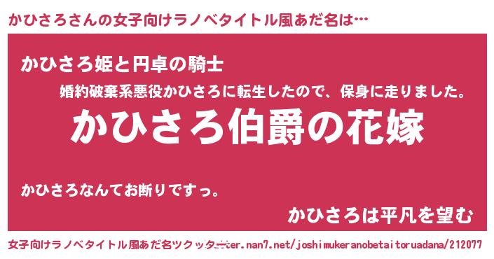 | 男性向けラノベタイトル風あだ名 | 『うちの娘の為ならば、俺はもしかしたらかひさろも倒せるかもしれない。』 |
