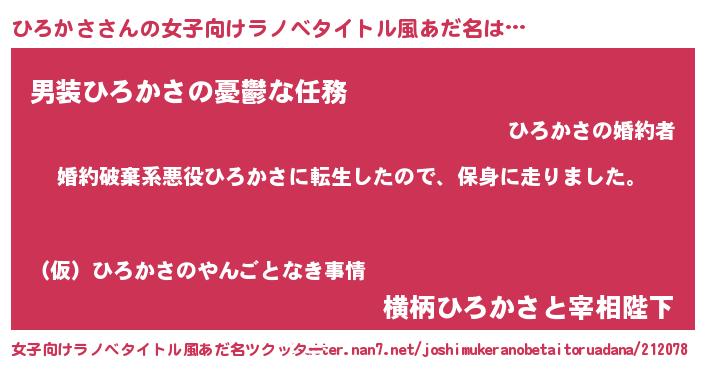 | 男性向けラノベタイトル風あだ名 | 『転生したらひろかさだった件』 |