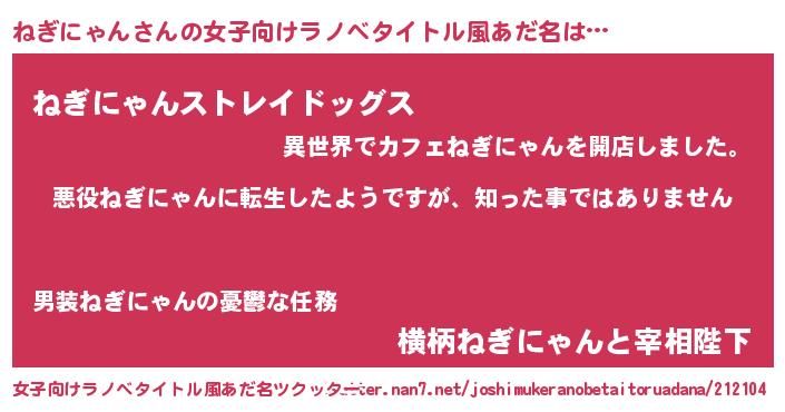 | 男性向けラノベタイトル風あだ名 | 『この素晴らしい世界にねぎにゃんを!』 |
