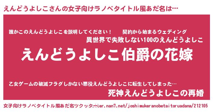 | 胡散臭い通販商品みたいなあだ名 | 『世界が平和になる高級そうな壺…その名も「えんどうよしこ」』 |