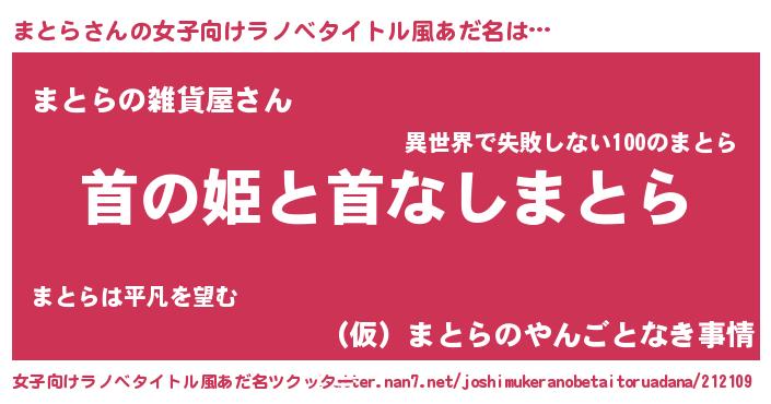 | 男性向けラノベタイトル風あだ名 | 『はたらくまとらさま!』『まとらの憂鬱』 |