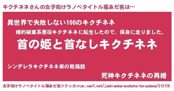 | 胡散臭い通販商品みたいなあだ名 | 『絶対に幸福をもたらす水素水…その名も「キクチネネ」』 |