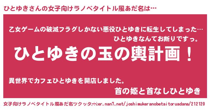 | 男性向けラノベタイトル風あだ名 | 『ひとゆき~年齢イコール彼女いない歴の魔法使い~』 |