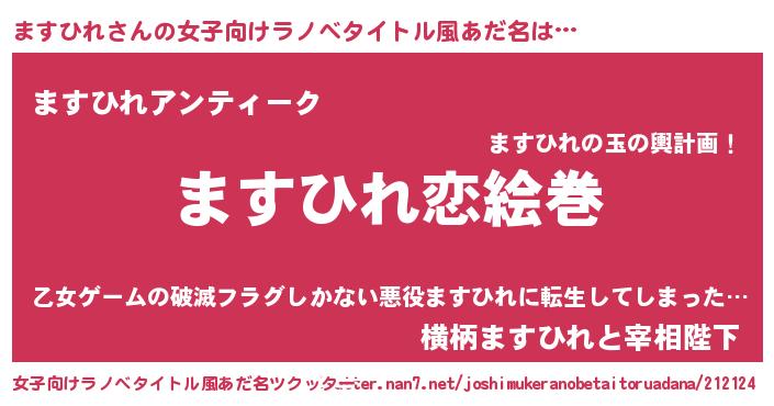 | 男性向けラノベタイトル風あだ名 | 『おまえをオタクにしてやるから、俺をますひれにしてくれ! 』 |