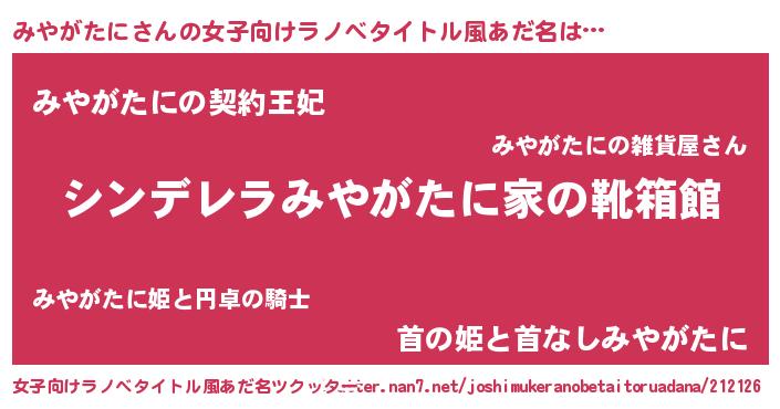 | 男性向けラノベタイトル風あだ名 | 『緋弾のミヤガタニ』『みやがたにの憂鬱』 |