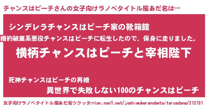 | 男性向けラノベタイトル風あだ名 | 『チャンスはピーチに滅ぼされるだけの簡単なお仕事です』 |