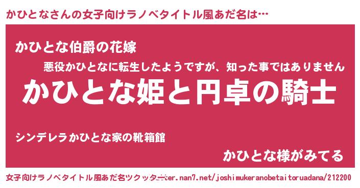 | 男性向けラノベタイトル風あだ名 | 『カヒトナアートオンライン』 |