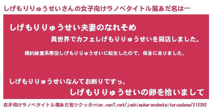 | 男性向けラノベタイトル風あだ名 | 『転生したらしげもりりゅうせいだった件』 |