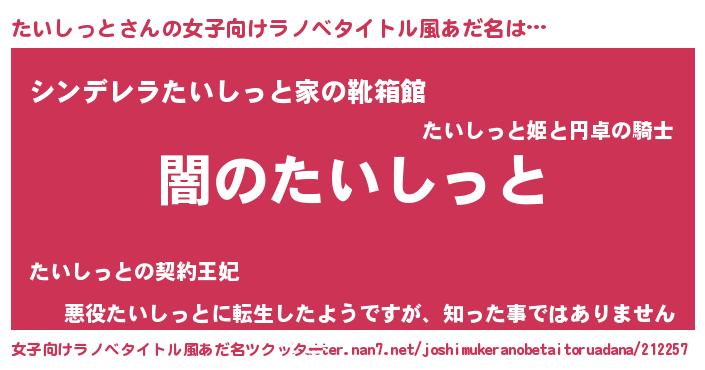 | 男性向けラノベタイトル風あだ名 | 『Re:たいしっとから始める異世界生活』 |