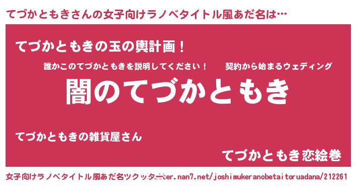 | 男性向けラノベタイトル風あだ名 | 『Re:てづかともきから始める異世界生活』 |