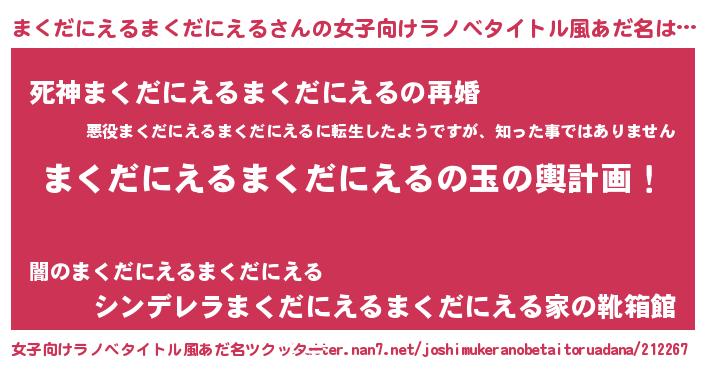 | 男性向けラノベタイトル風あだ名 | 『まくだにえるまくだにえる~年齢イコール彼女いない歴の魔法使い~』 |