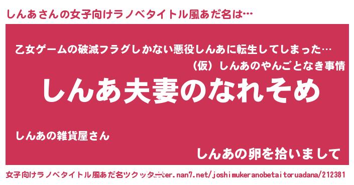 | 男性向けラノベタイトル風あだ名 | 『おまえをオタクにしてやるから、俺をしんあにしてくれ! 』 |