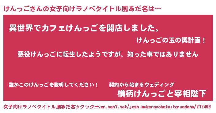 | 男性向けラノベタイトル風あだ名 | 『この素晴らしい世界にけんっごを!』 |