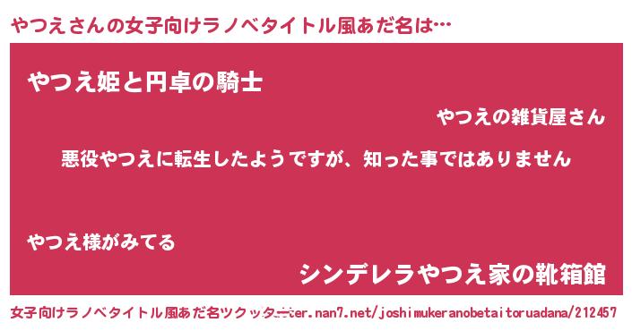 | 男性向けラノベタイトル風あだ名 | 『この素晴らしい世界にやつえを!』 |