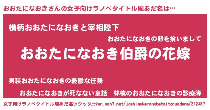 おおたになおきさんの女子向けラノベタイトル風あだ名は… 『おおたになおき伯爵の花嫁』『横柄おおたになおきと宰相陛下』『おおたになおきが死なない童話 林檎のおおたになおきの診療簿』 ツクッター #女子向けラノベタイトル風あだ名ツクッター http://tkutter.nan7.net/joshimukeranobetaitoruadana/212487/