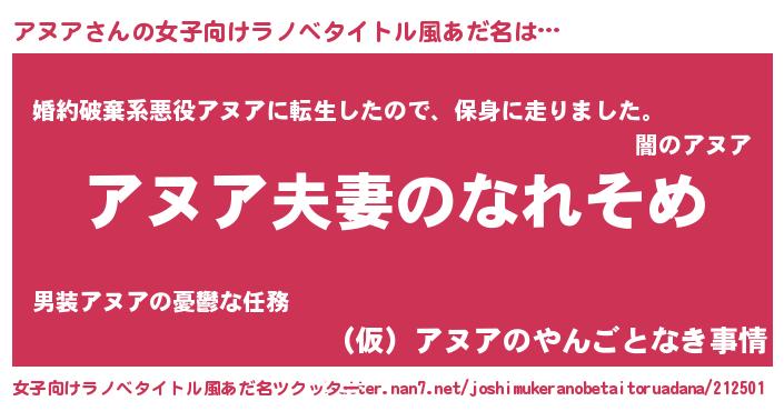 | 男性向けラノベタイトル風あだ名 | 『おまえをオタクにしてやるから、俺をアヌアにしてくれ! 』 |
