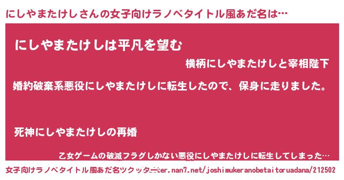 | 男性向けラノベタイトル風あだ名 | 『転生したらにしやまたけしだった件』 |