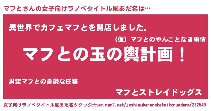 | 男性向けラノベタイトル風あだ名 | 『マフと~年齢イコール彼女いない歴の魔法使い~』 |
