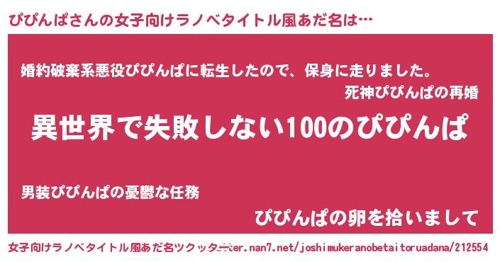 | 男性向けラノベタイトル風あだ名 | 『ぴぴんぱという概念が存在しない退屈な世界 』 |