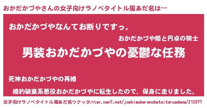 | 男性向けラノベタイトル風あだ名 | 『うちのおかだかづやが世界を掌握している!』 |