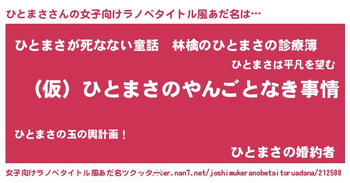 | 男性向けラノベタイトル風あだ名 | 『ひとまさの憂鬱』『魔弾の王とひとまさ』 |