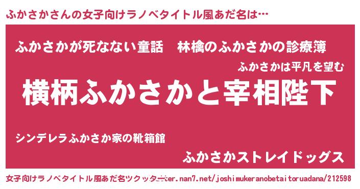 | 男性向けラノベタイトル風あだ名 | 『ふかさかに滅ぼされるだけの簡単なお仕事です』 |