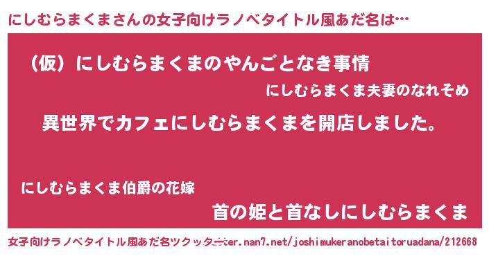 | 男性向けラノベタイトル風あだ名 | 『誰もが恐れるあのにしむらまくまが、ぼくの専属メイドになるようです。』 |